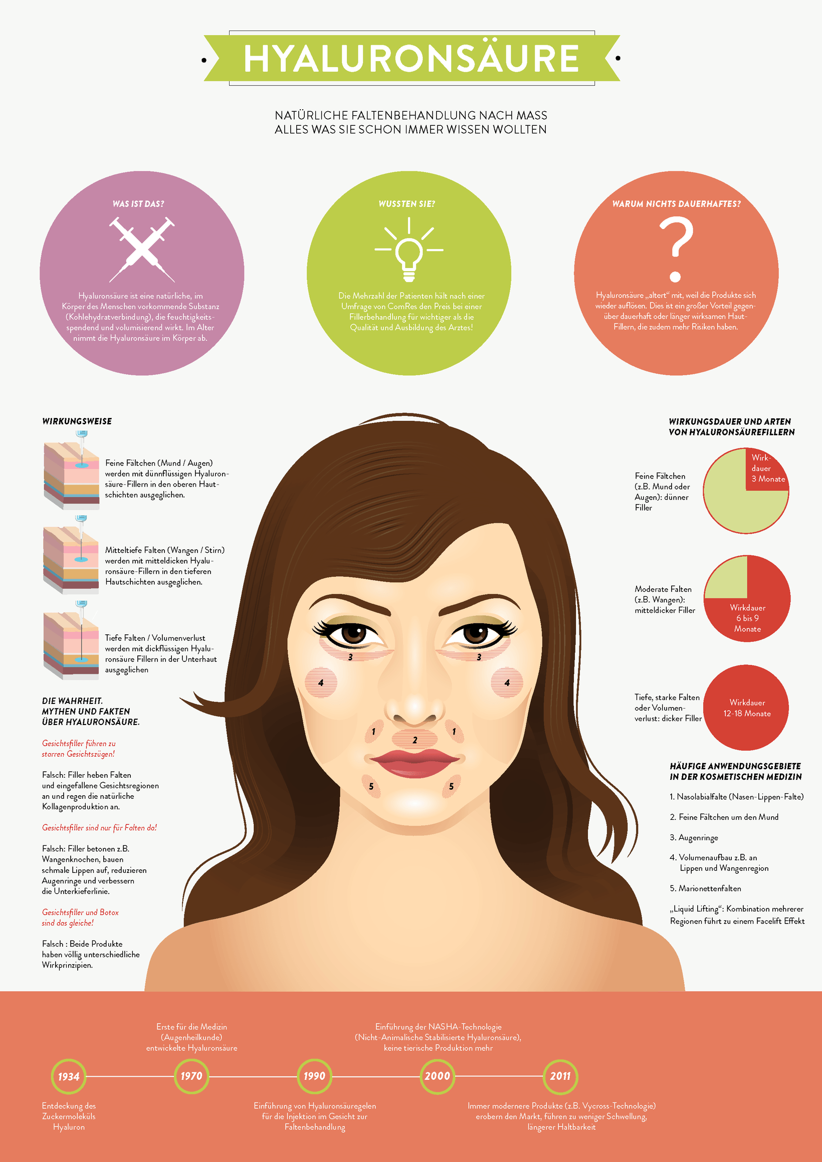 - Ziel: Faltenminderung im Gesicht, Hals oder Dekolletee durch Auffüllung mit Hyaluronsäure. Wiederherstellung von Volumen (Wangen/Wangenknochen/Lippen) und Auffüllung auch von tiefen Falten, Dellen, eingefallenen Gesichtspartien